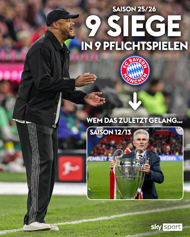 根据数据统计,拜仁在新赛季的前9场赛事中均取得胜利。上一次取得如此优异的开局是在2012-13赛季,当时海因克斯执教的拜仁获得了欧冠、德甲和德国杯三项赛事的冠军。